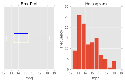 The data was initially saved in a Google Docs spreadsheet: the date, miles driven since last fill up, amount of gas pumped into the tank, the price per gallon, and gas station. Each time the tank was filled up completely, allowing the average miles per gallon to be computed over the past tank. There is some noise to be expected since the pumps may not all be calibrated quite the same way and may not fill the tank up to the exact same amount each time. At the time of writing, there are 114 observations.